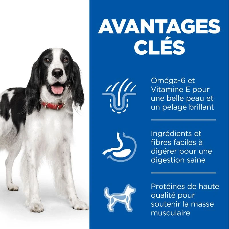 - Contient également des acides gras Oméga 6 et de la vitamine E pour que votre chien garde un pelage soyeux et conserve une peau saine.