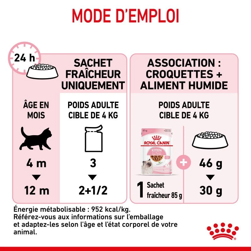 Pour compléter cet émincé en sauce et varier les textures, vous pouvez combiner cet aliment avec les croquettes Royal Canin pour Chaton.