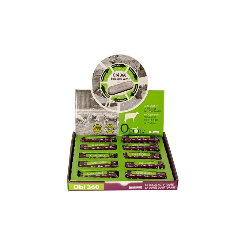 Obi 360 est un bolus d’oligo-éléments, apportant des éléments essentiels comme le sélénium, l’iode, le cuivre, le zinc et le manganèse.
