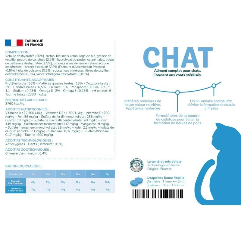 - Molécules pro bioactives (ProbioactifFAP) pour prévenir tout au long du tractus digestif face aux déséquilibres de la flore et renforcer l’intégrité et l’immunité de votre chat