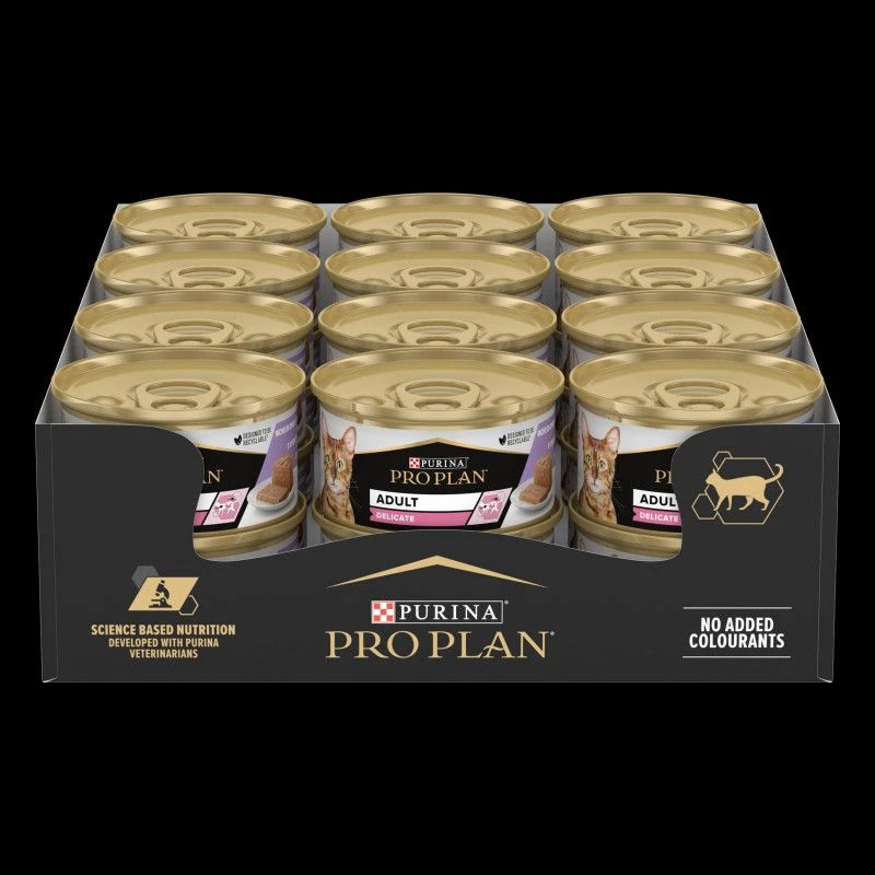 Les boîtes Purina Pro Plan Cat delicate mousse à la dinde sont spécialement conçues pour les chats adultes ayant des sensibilités digestives