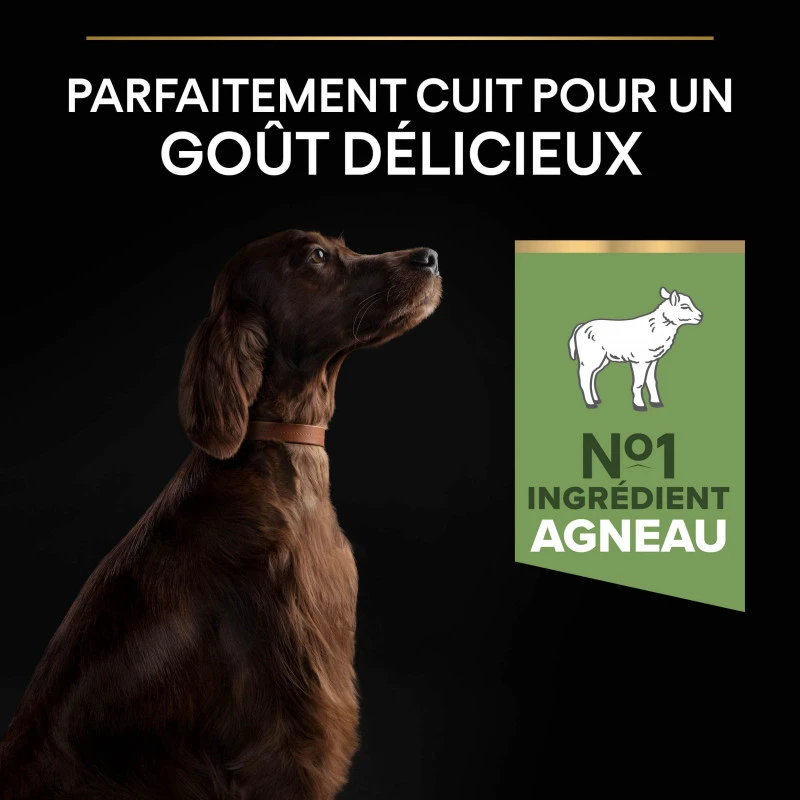 - La principale source de protéines est l’agneau, une viande tendre qui maintient la masse musculaire de votre chien. Idéal pour les chiens avec un estomac sensible.