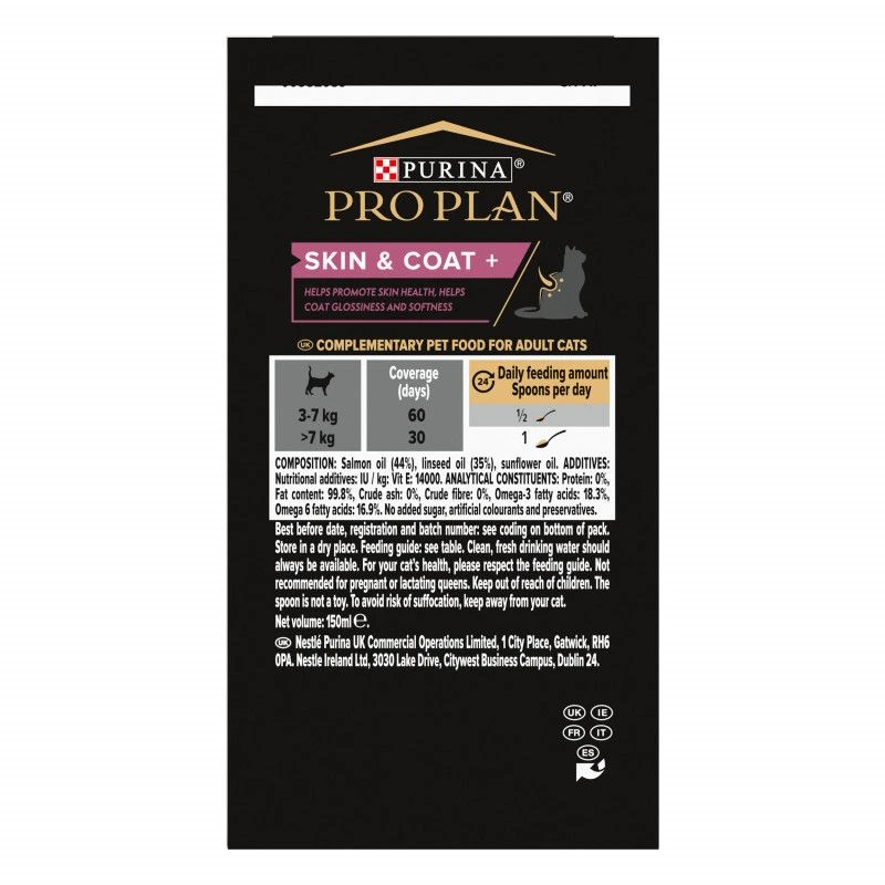 PRO PLAN® Skin & Coat+ nourrit la peau et le pelage de votre chat de l’intérieur, grâce à sa formule riche en nutriments essentiels (tels que les acides gras Oméga 3 et 6 issus d’huile de saumon de Norvège, l’huile de lin et la vitamine E).
