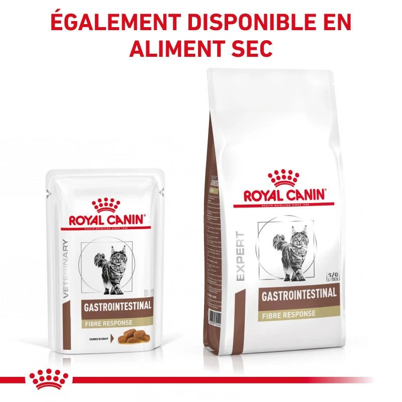 Existe aussi en sac de croquettes, Le Cat Gastro Intestinal Fibre Response morceaux de viande fait partie de la gamme Royal Canin traitant des problèmes digestifs du chat de toutes races et de tout âges.