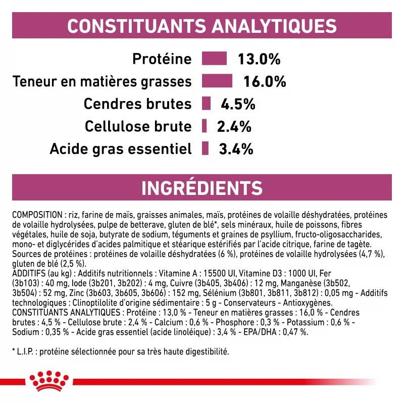 - Un taux de phosphore réduit, un apport d’antioxydants, d’EPA et de DHA (huile de poisson)*.