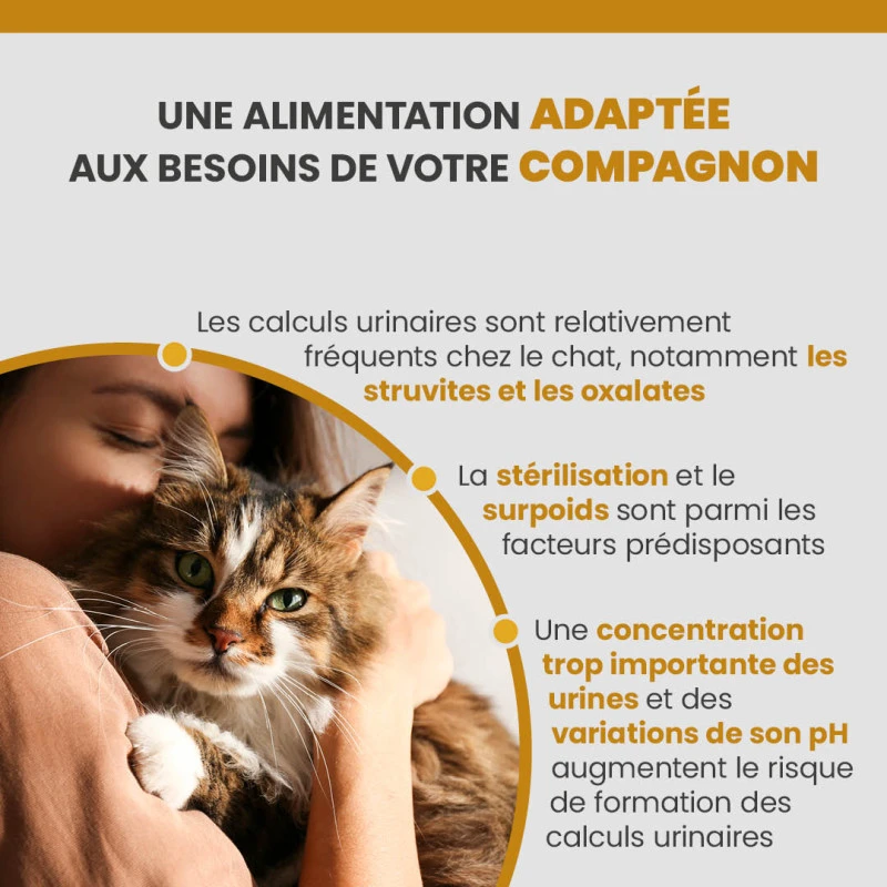 - Un faible indice RSS pour minimiser le risque de formation de nouveaux calculs de struvite et d’oxalate de calcium dans les urines.