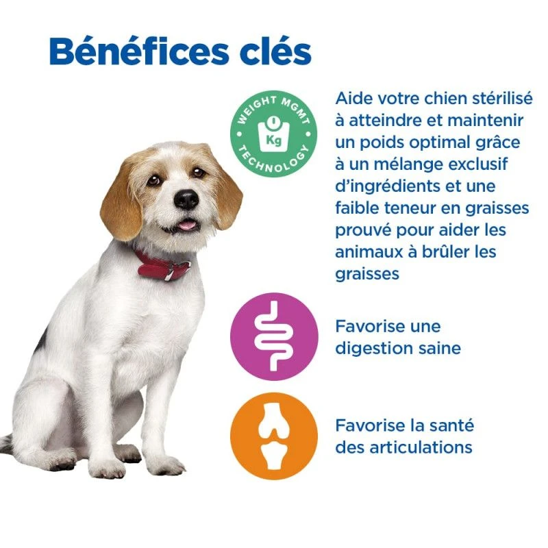 - Gestion du poids : aident votre chien stérilisé à atteindre et maintenir un poids optimal grâce à un mélange unique d’ingrédients et une faible teneur en graisses