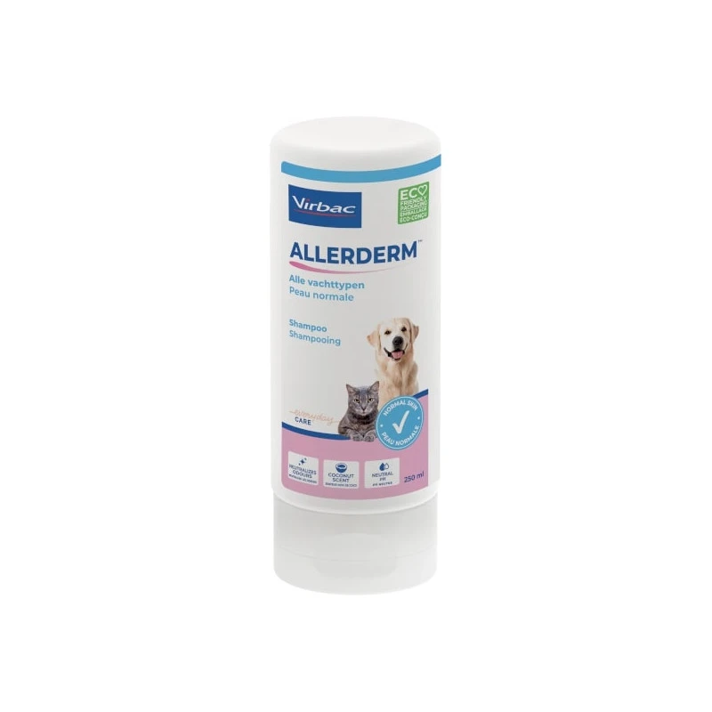Le shampooing Allerderm de Virbac est spécialement conçu pour hydrater la peau et neutraliser les mauvaises odeurs chez votre animal.